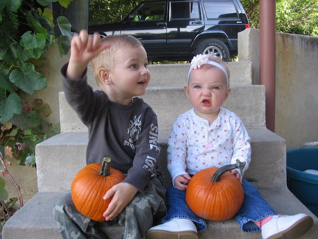 Our Landlord told Luke he could go pick a pumpkin in the garden. So he got one for himself, then said, "Abbie need a pumpkin". He went and picked out a "baby" pumpkin for his sister. He's such a good brother.