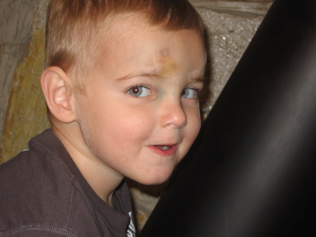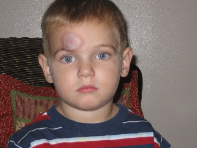 I was kinda scared to go out in public after Luke did this for fear of being reported. Everybody kept asking what happened, even strangers in the store. His bump was SO huge! Luke was running after a bouncy ball and tripped and ran head first into our stove. It scared me a little, I've never seen such a bump. Then a couple days later, he fell into a lego table and hit the other side of his forehead. Both of his eyes started to go black, but he's starting to look better.