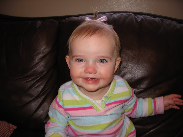 So cute! Don't you wish they would just keep it in after you go to all that trouble. Brecklynn looks like Turk from the Jungle Book when she wakes up from naps because she pulls the pony out and sleeps funny on it. They are so funny! I love Abby's smile!