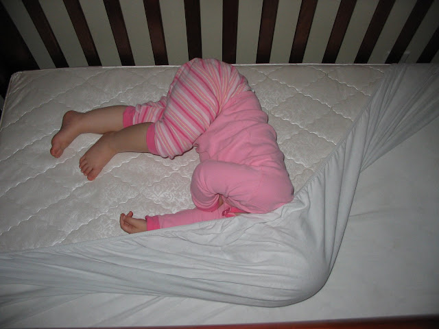 That is too funny!!!! I love catching my kids sleeping in strange positions. We once found Kaitlyn sleeping in her dresser drawer -- she pulled it out and climbed right in and fell asleep.