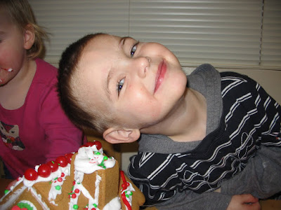 We did a gingerbread house for FHE tonight. Luke wanted it to look exactly like the picture on the front of the box. I stuck the gingerbread people on the back of the house instead of the front and he didn't like it too much. Abigail liked to put the candy on the house just to remove and eat it five seconds later. She also liked the bag of icing.