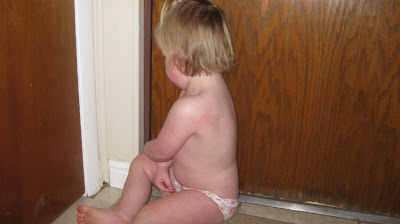 Here's Abigail, pouting in the corner because I wanted her to put clothes on.
