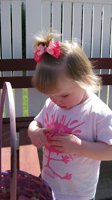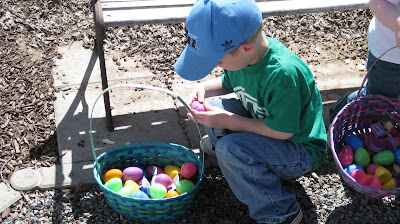 My Mom did an Easter egg hunt on Sunday. Luke ran around the yard gathering eggs in a hurry, while Ab stopped and opened every egg before moving on.