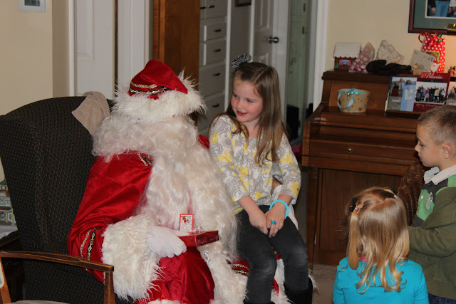 Santa surprised us this year! Most of the kids freaked out with excitement and the others just freaked out. You can see which side Carly was on. She wrapped her legs around me so tight, I couldn't pry her off.