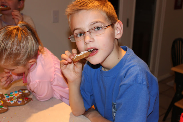 I was happy to forgo the usual gingerbread house this year, when we found these cute little men. So much better having one for each of the kids instead of trying to fit four different visions onto one house. My only mistake of the night was bathing my kids before the decorating... seriously what was I thinking?