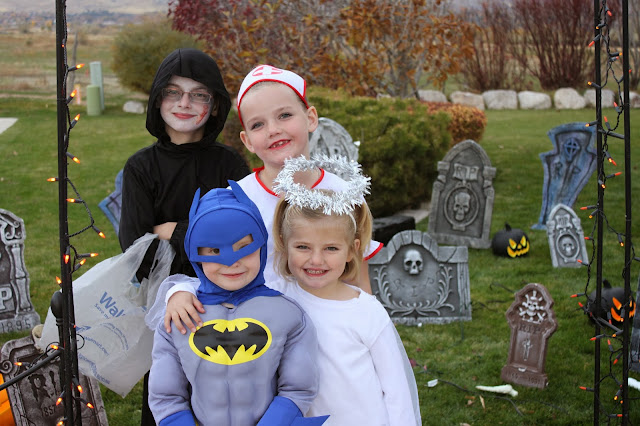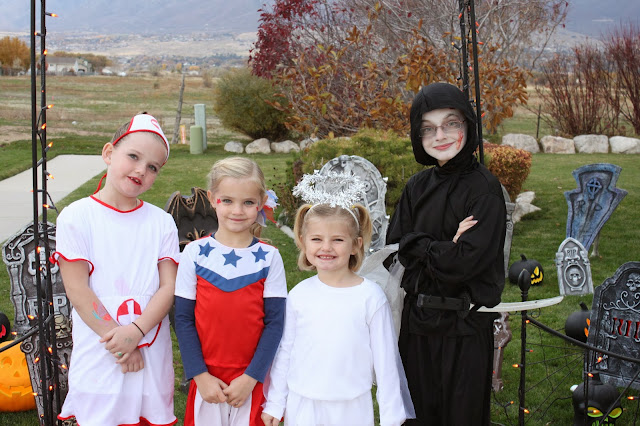 We have a nurse, a cheerleader (or captain America as Ben said), an Angel, and a Ninja (which Luke ended up hating the mask, and wanted to paint his face... so a zombie ninja I guess).