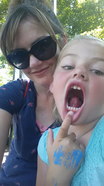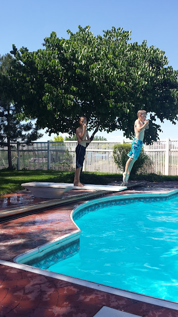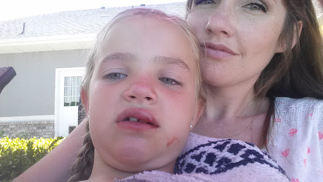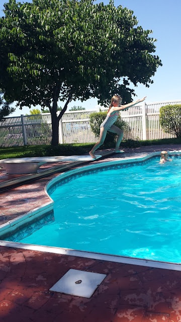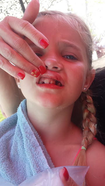 Luke and Abigail were in the same class, and they went first. Carly and Hailey were right after them in the same class too. While Carly was waiting for her turn one day, she smacked her face with her knee on the tramp. She knocked out her baby tooth and bled for a while. She was mostly upset because she couldn't swim that day. We always take pictures to send to Dad when the kids get hurt.