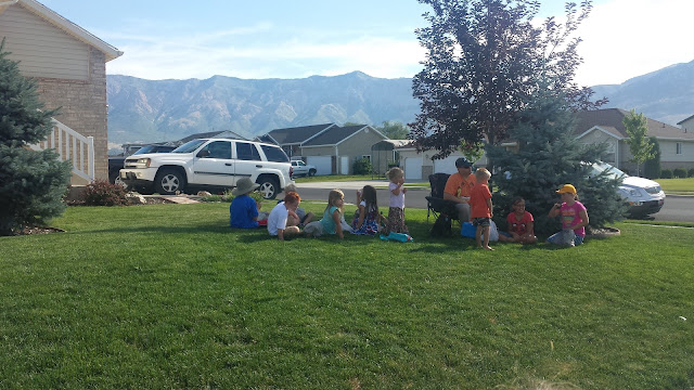 We went to our Harrisville parade and got lots of candy. For such a short parade, they throw out tons. All the neighbor kids sat and ate their candy together.