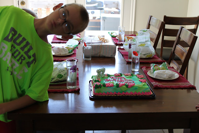 I attended a baptism for primary that morning. When I came home and walked into the house it was perfectly silent and empty. I said HELLO?? I heard a little baby voice coming from the pantry saying Hello! Hello! Isaac blew everyone's cover while they were waiting to yell 'surprise!' It was so cute. They had lunch and cake for me and set the table up. Ben knew it was the only time we'd have to squeeze in a little celebration.