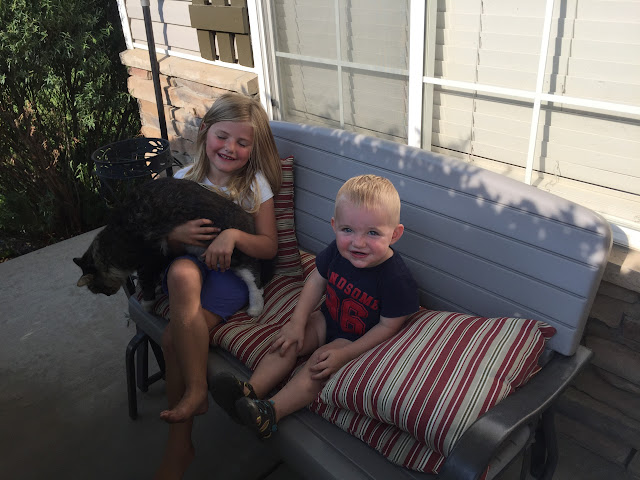 Hailey snuck over to pet the neighbor's cat. I tell her to go play with their animals when ever they ask for one of their own.